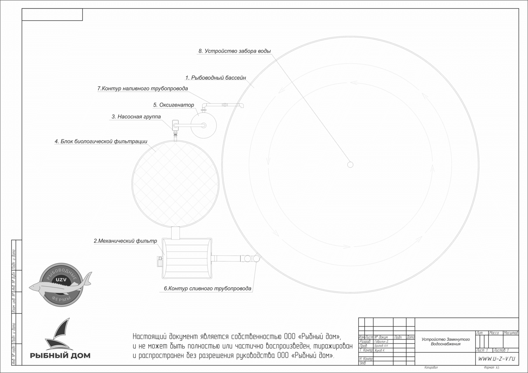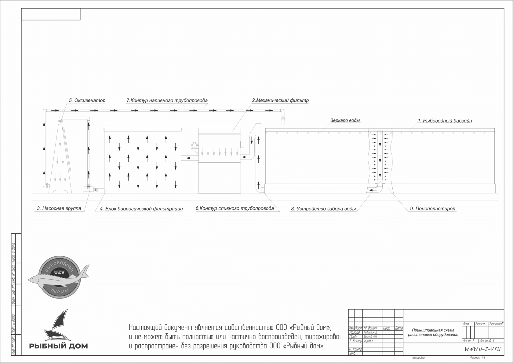 2.1.1. Устройство Замкнутого Водоснабжения «UZV 2000» (в дальнейшем – «UZV 2000») предназначено для индустриального выращивания ценных пород рыб (осетровых пород, радужной форели) интенсивным способом.